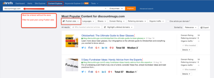 Break those top-performing articles down by the number of backlinks they have pointing to them and the number of social shares they’ve drawn (Ahrefs).