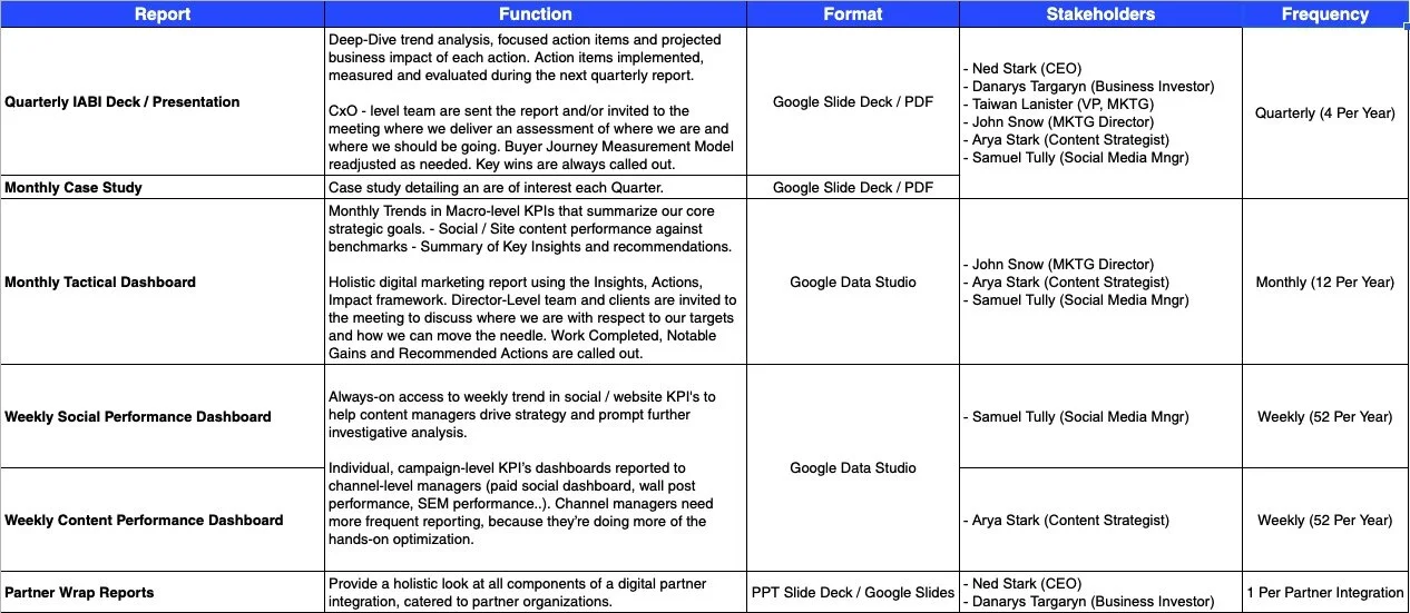 In your calendar, you’ll want to note which stakeholders receive which reports and lay out the purpose/value of each report.