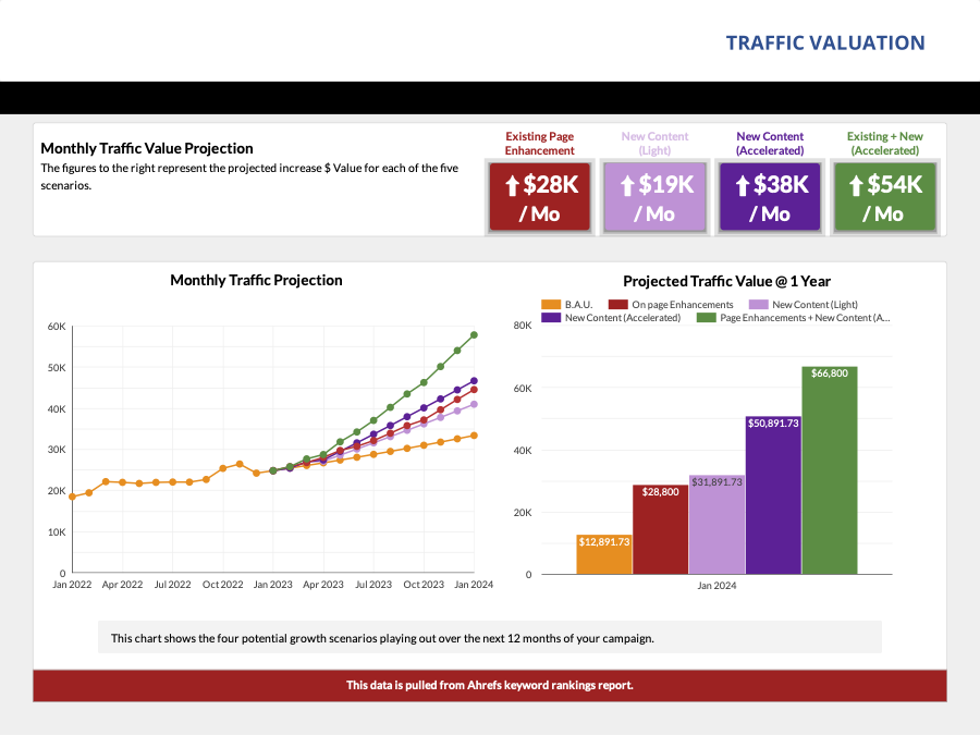 Organic Growth Projection: We’ll deliver a custom report to help you project future organic traffic, leads and sales after implementing a growth campaign.
